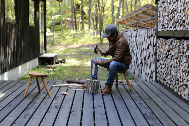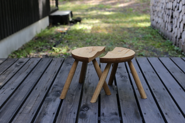 工房庭の楢の木を使って作ったファイヤーサイドスツールです。